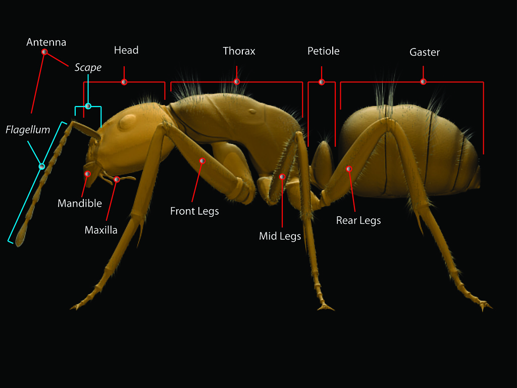 Ants Anatomy. Pesky ants are a nuisance when they invade your home, particularly when they start contaminating your food. Despite its size, the ant's anatomy can be quite fascinating, with the body being composed of multiple parts, each with its own special function. What is and what is not an ant? The mandibles are dented and used to . Ant anatomy (ant morphology) · 1.